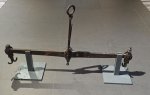 На фотографии весы коромыслового типа. Они появились еще на рубеже 17 и 18 веков и постепенно заменили менее точные «русские безмены». Экземпляр выполнен из черного металла. Он довольно монументален: размах плеч 112 см. Весы имеют три клейма.